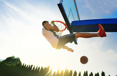バスケット ボール通りプレーヤー後部のスラムダンクを作るします バック グラウンドでのニューヨーク マンハッタンの建物 の写真素材 画像素材 Image